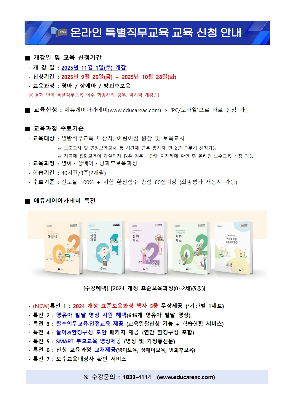 [에듀케어아카데미] 보육교직원 온라인 특별직무교육 2025년 11월 개강 교육신청안내