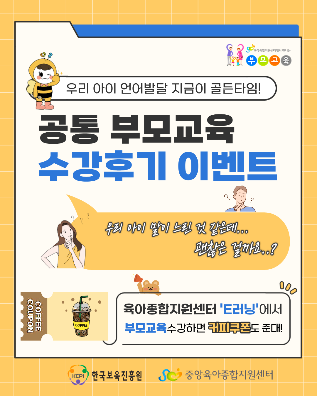 - 참여기간: ~25.11.28.(금)까지 - 참여방법: 중앙육아종합지원센터 e러닝 사이트에서 "우리 아이 언어발달 지금이 골든타임!" 수강 후, 구글 폼에 수강후기 남기기 - 발표방법: 당첨자 대상 개별 연락(추첨을 통해 총 300분께 커피쿠폰을 드립니다!) |