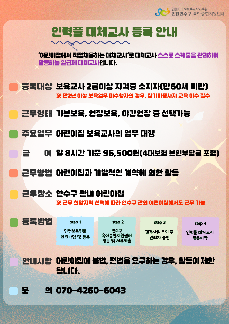 [연수구육아종합지원센터] 연수구육아종합지원센터 인력풀 대체교사 등록 안내