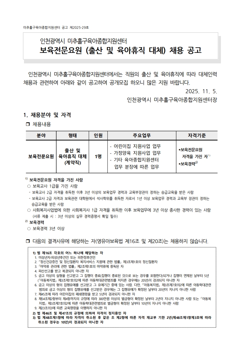 붙임1_공고29호-미추홀구육아종합지원센터 보육전문요원_육아휴직 대체 채용 공고.pdf