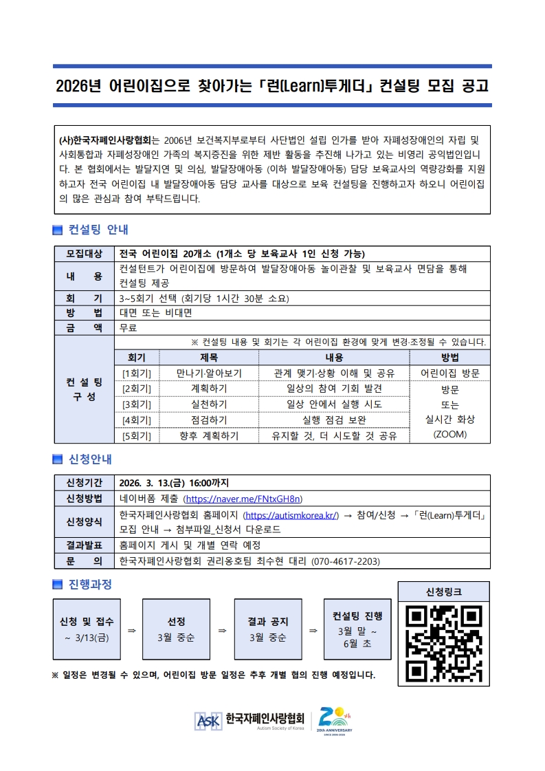 [한국자폐인사랑협회] 발달장애아동 보육지원사업 「런투게더」 컨설팅 모집