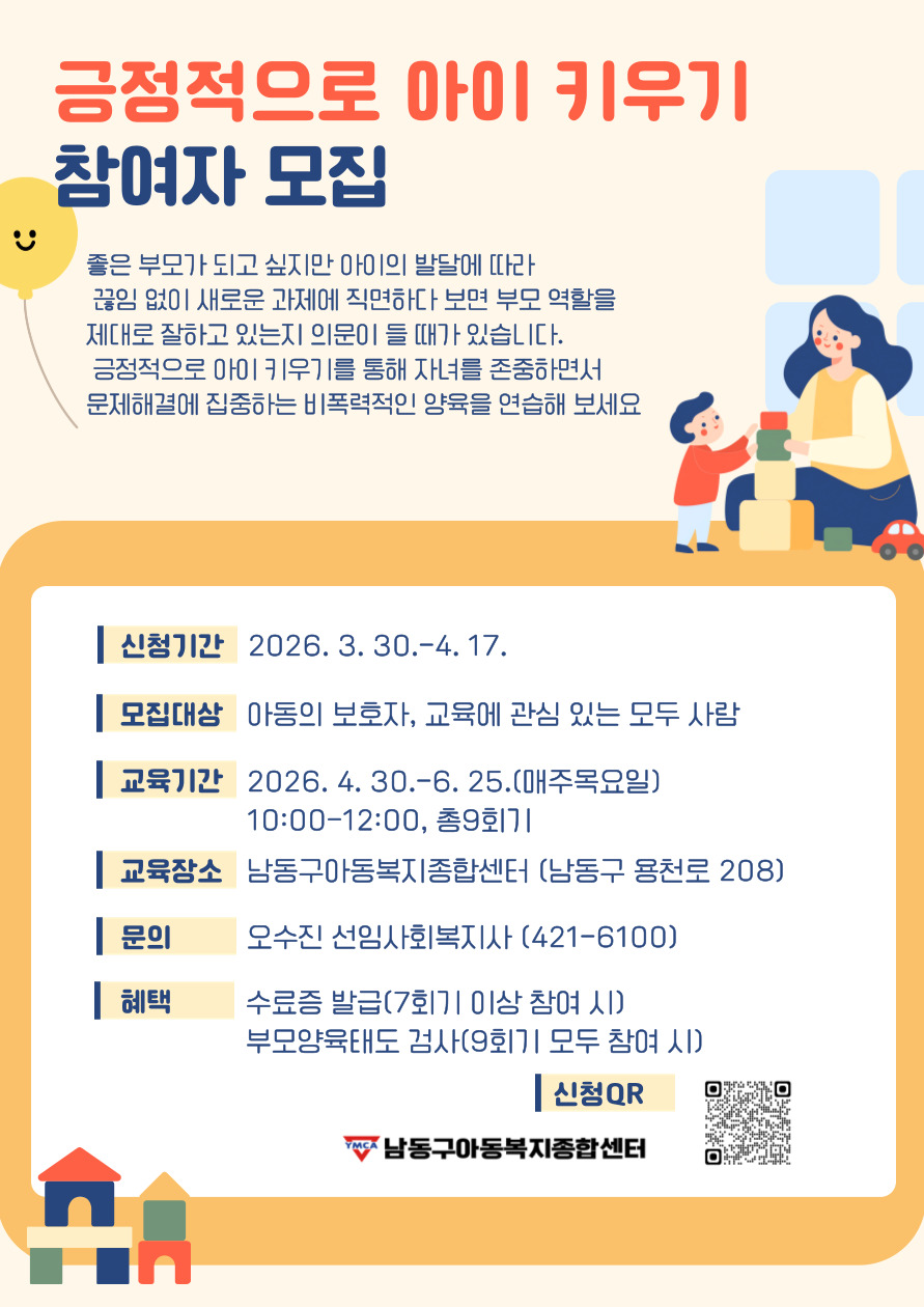 [남동구아동복지종합센터] 긍정적으로 아이 키우기 교육 참여자 모집 안내