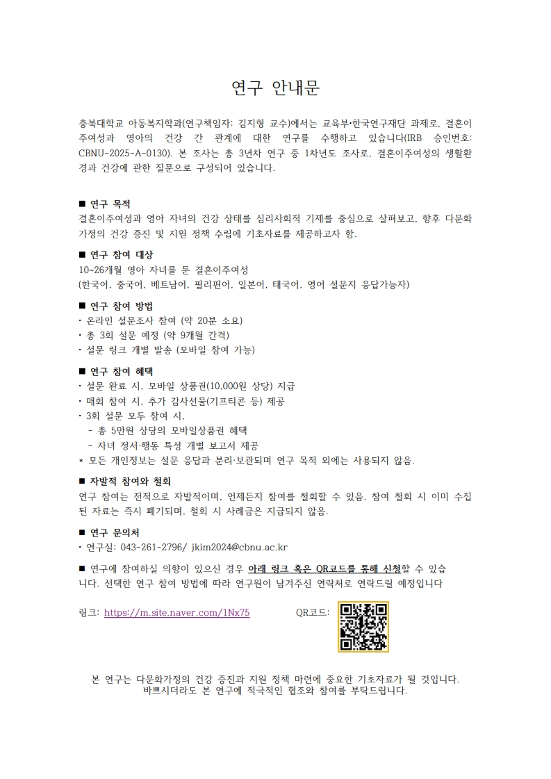 다문화 가정 건강 증진을 위한 정책 기초자료 수집 협조 안내