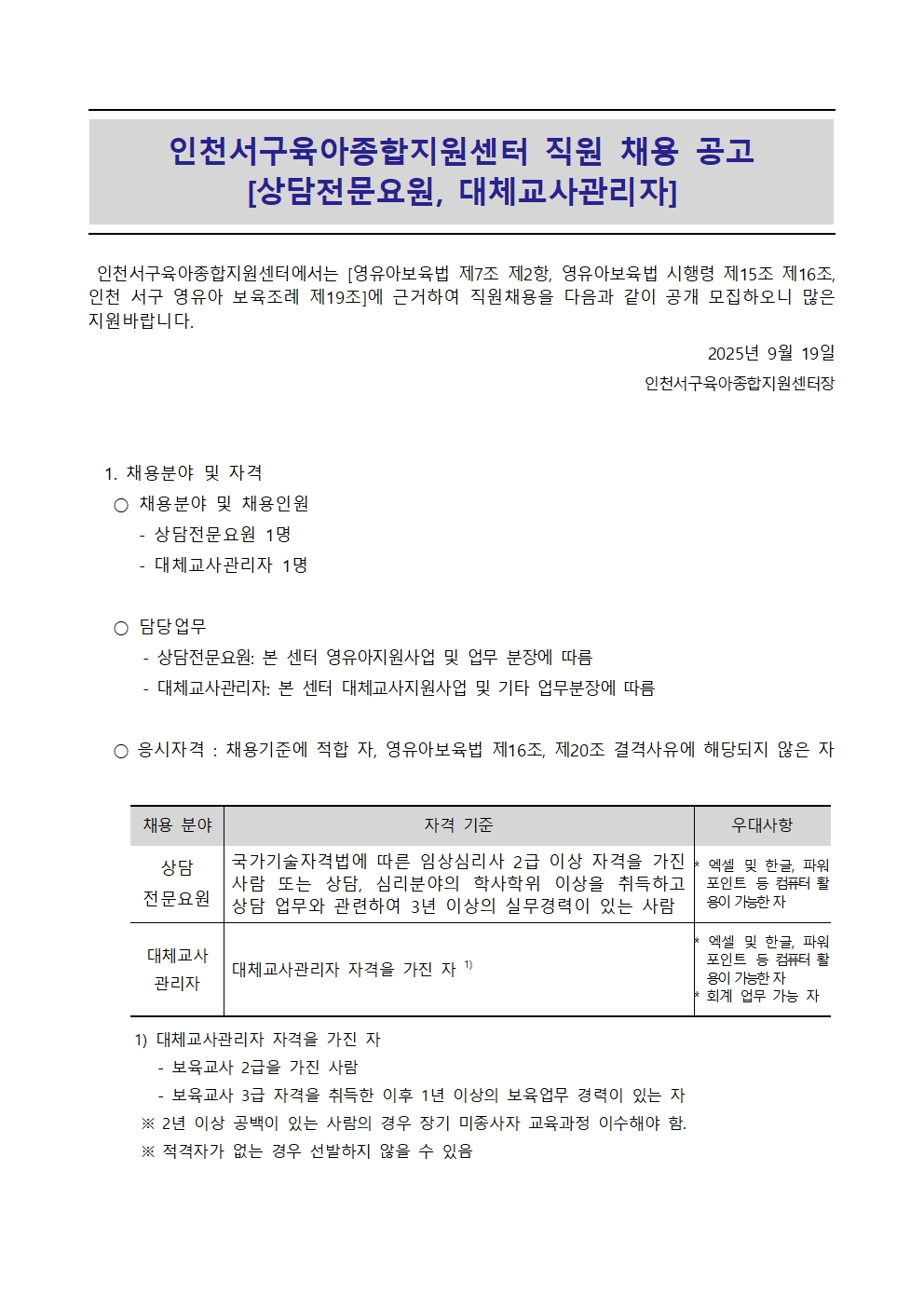 [서구육아종합지원센터] 직원(상담전문요원, 대체교사관리자) 채용 공고