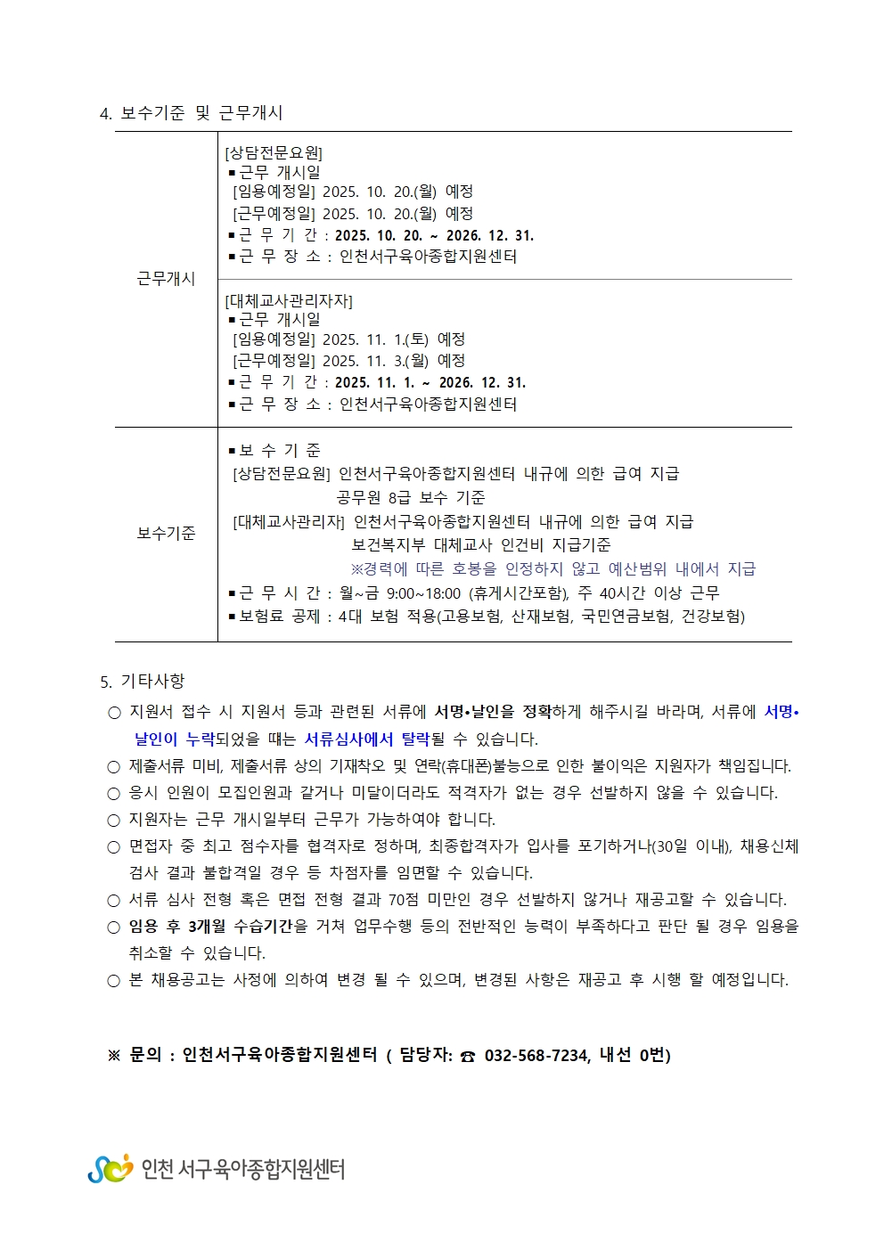 [인천서구육아종합지원센터] 상담전문요원, 대체교사관리자 채용 공고.pdf