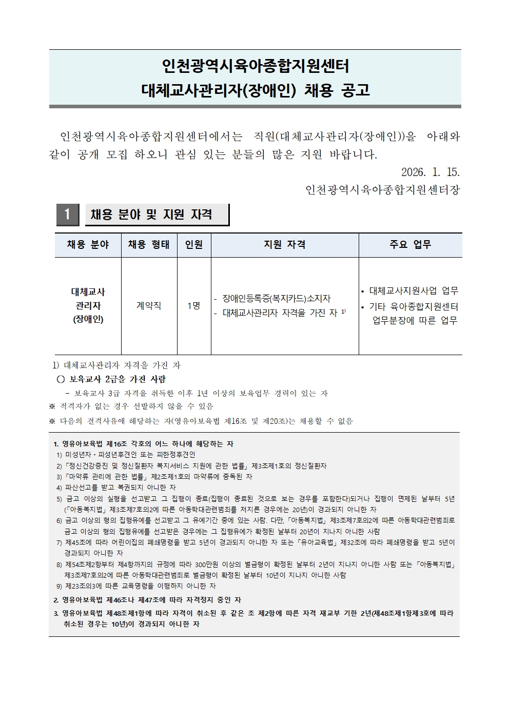 [인천광역시육아종합지원센터] 인천광역시육아종합지원센터 대체교사관리자(장애인) 채용 공고