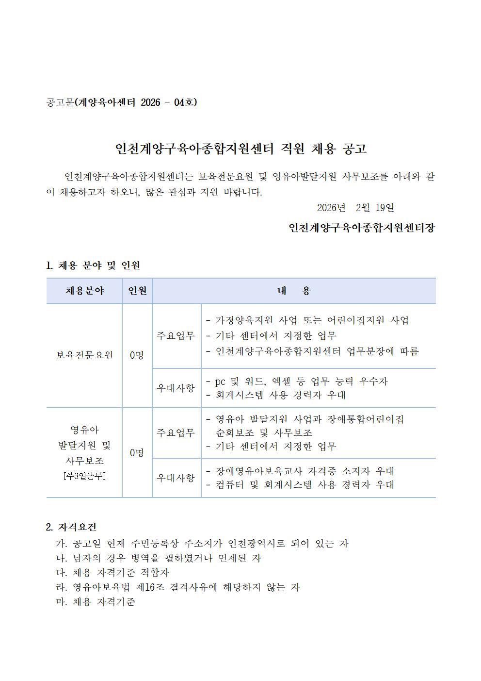 [인천계양구육아종합지원센터] 2026년 계양구육아종합지원센터 직원 채용 공고