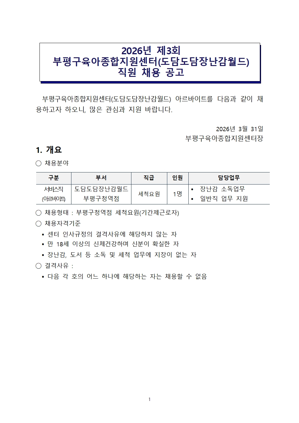 [본센터] 제3회 부평구육아종합지원센터(도담도담장난감월드) 아르바이트 채용 채용 공고