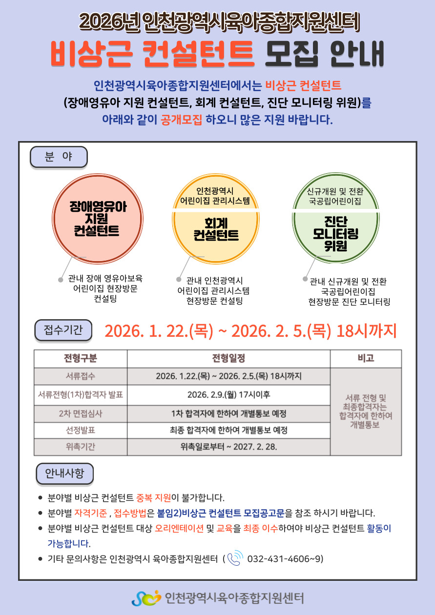 [인천광역시육아종합지원센터] 2026년 인천광역시육아종합지원센터 비상근 컨설턴트 모집 공고