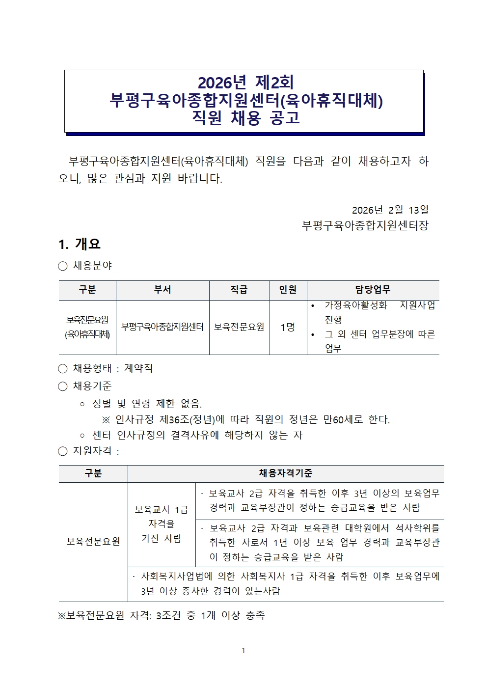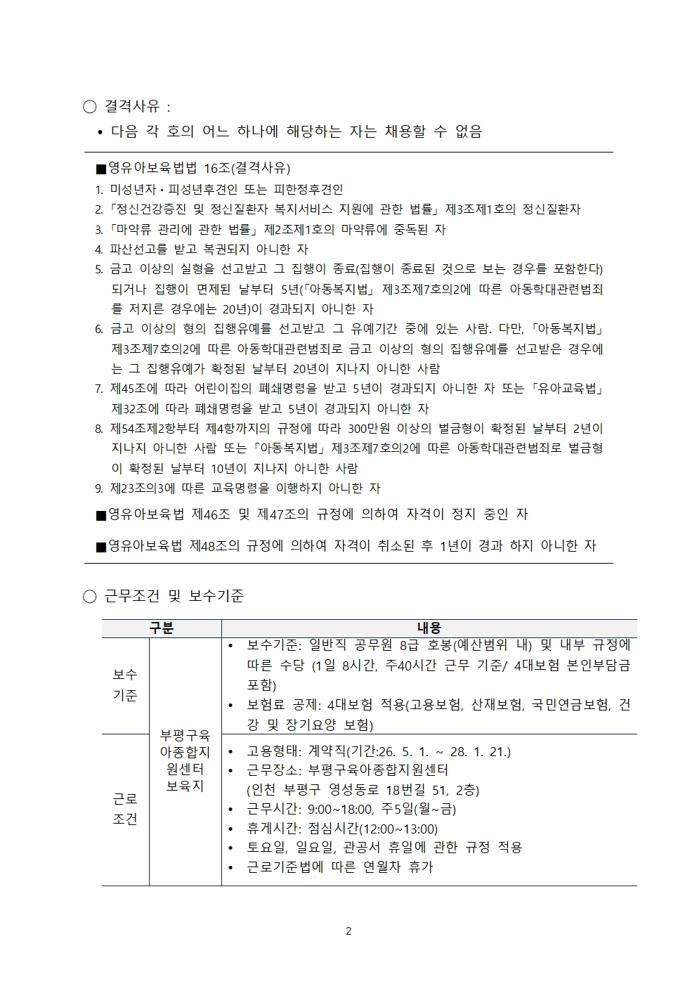 [본센터] 제2회 부평구육아종합지원센터 직원 채용(보육전문요원-육아휴직대체) 채용 공고