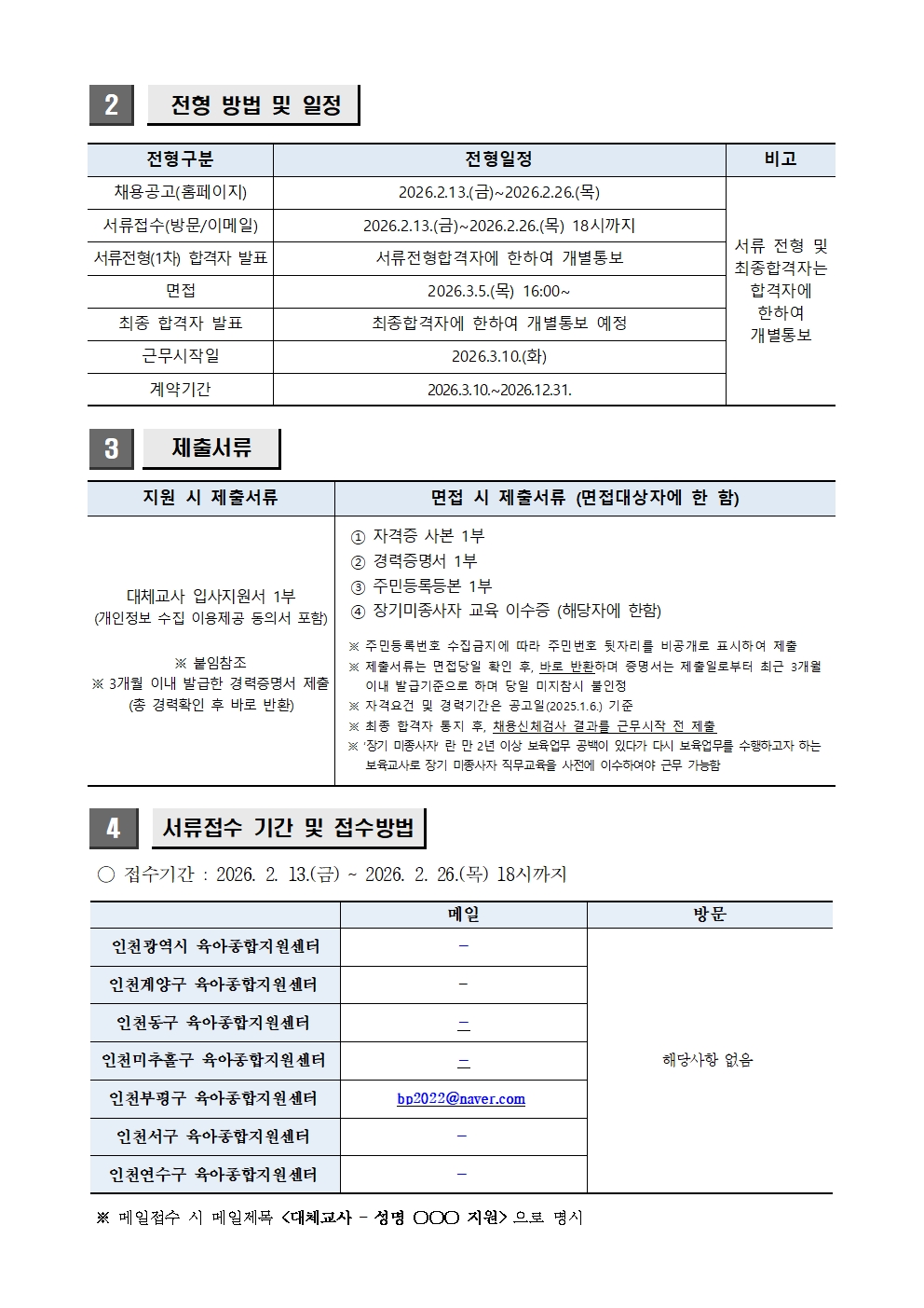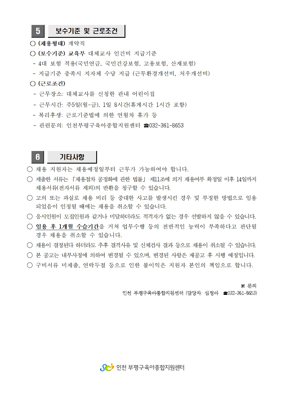 2026년도 부평구육아종합지원센터 대체교사 채용공고(2차)