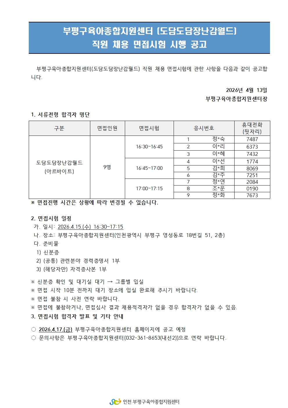 [본센터]2026년 제3회 부평구육아종합지원센터(도담도담장난감월드) 직원 채용 면접시험 공고