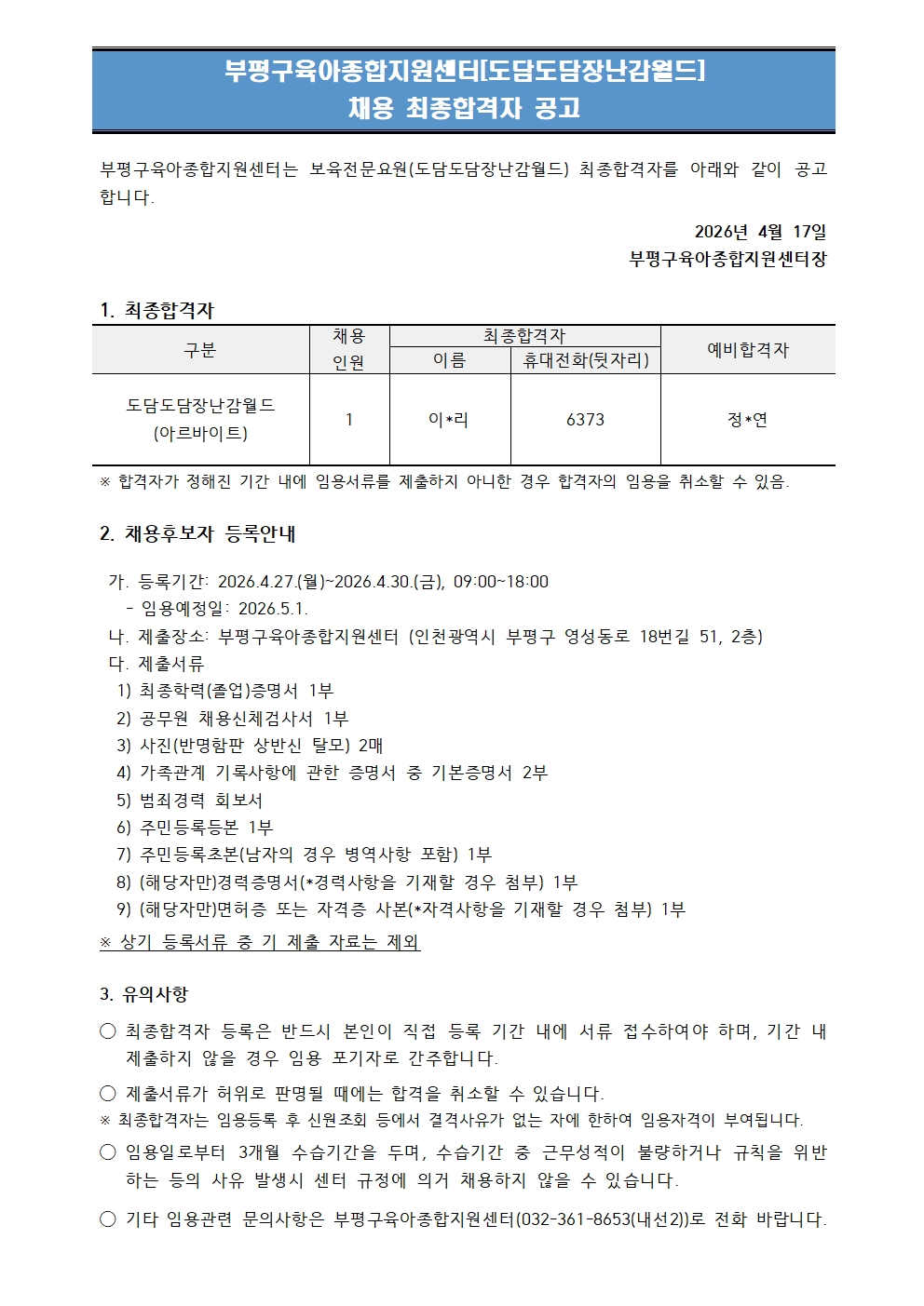 [본센터]2026년 제3회 부평구육아종합지원센터(도담도담장난감월드) 직원 채용 최종합격자 공고